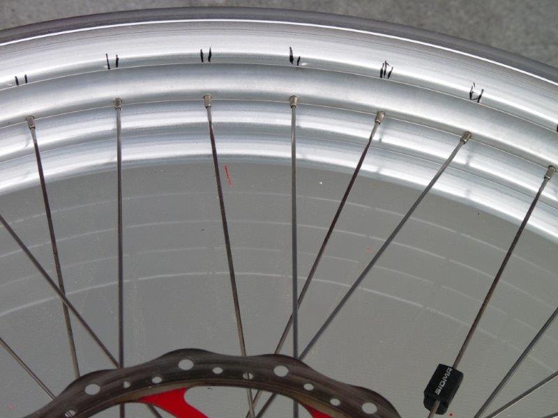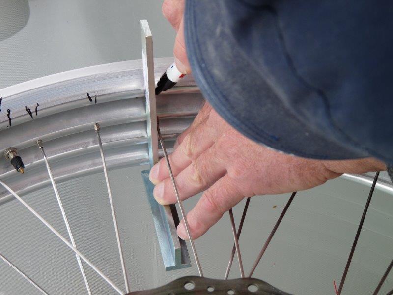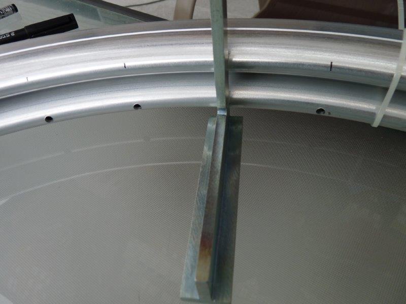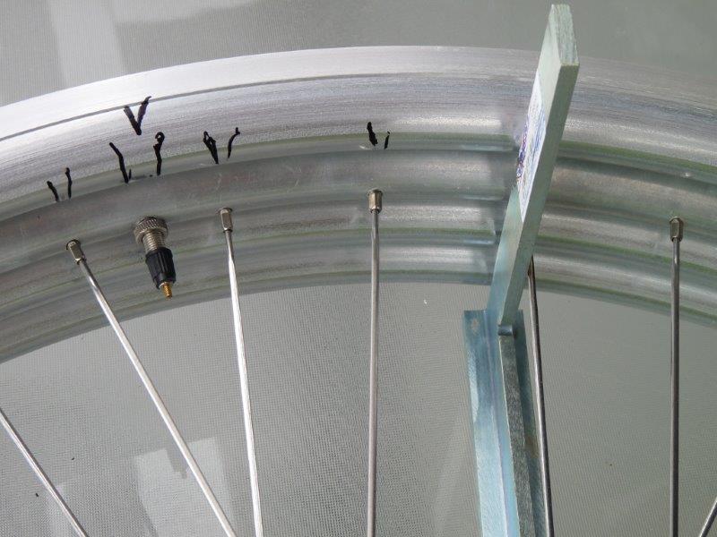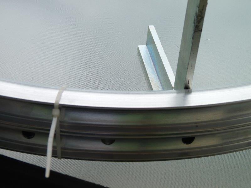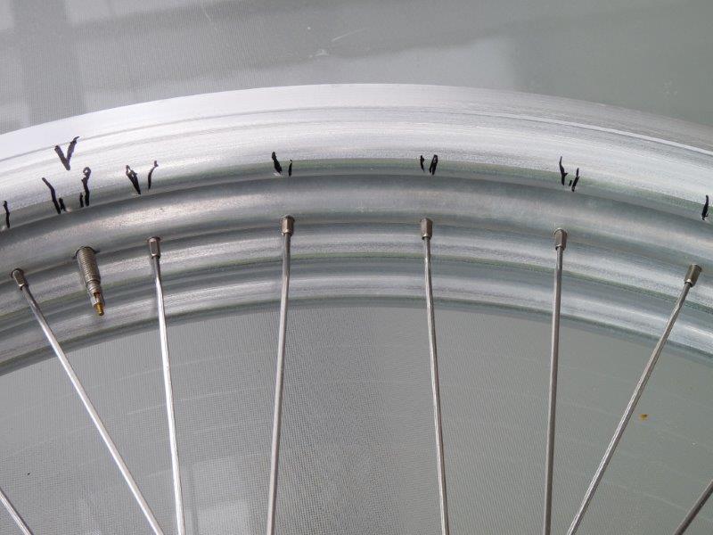 Auf einer ebenen Glastischplatte werden die Felgen genau aufeinander ausgerichtet und die Nippellöcher