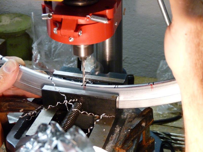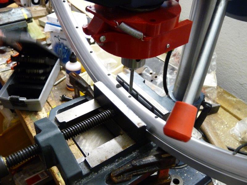 Die kleinen Nippellöcher werden zuerst von der Nabenseite und zwar durch beide Wände der Hohlkammerfelge in einem Gang gebohrt.